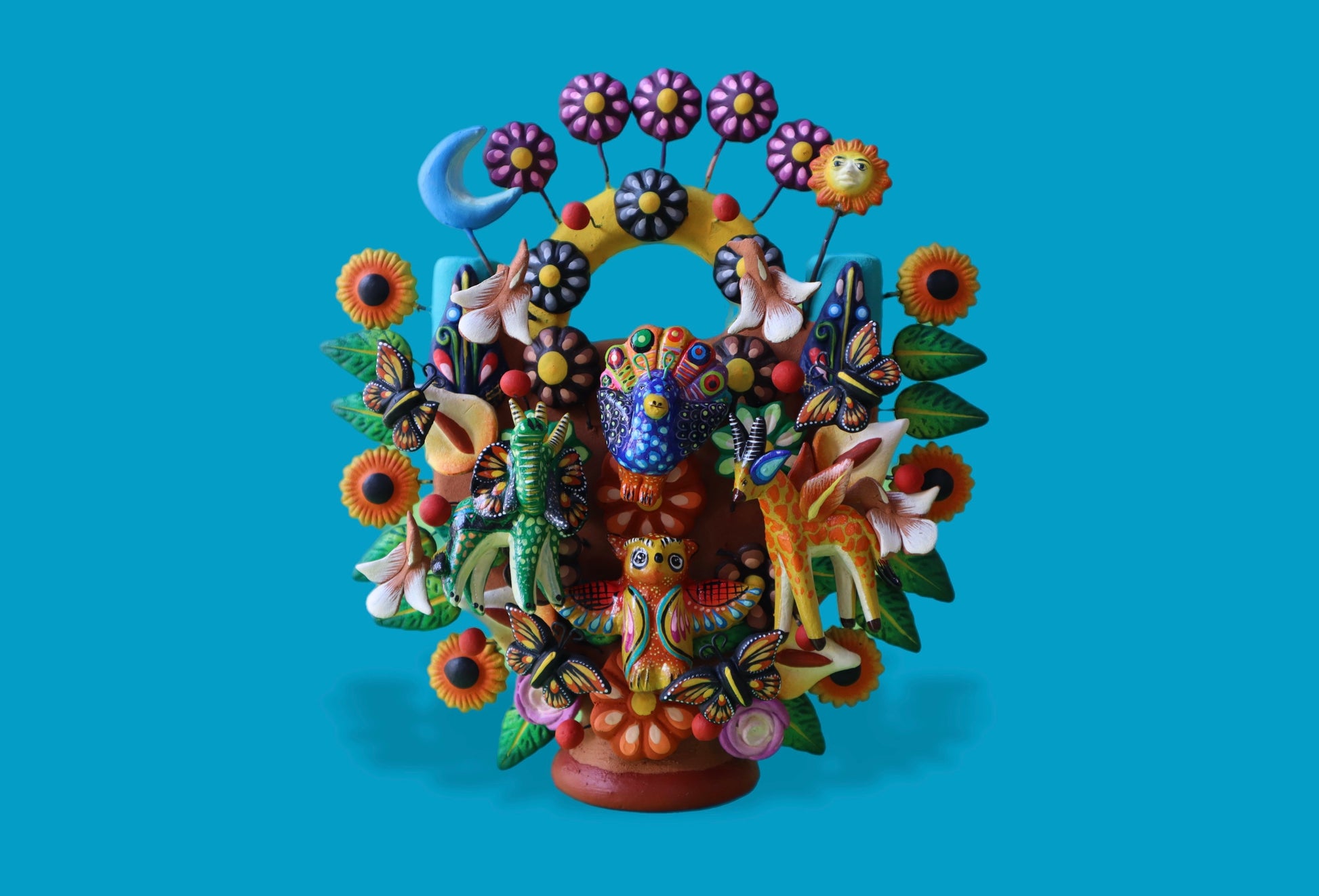 Colorido Árbol de la Vida hecho de barro y con un Largo de 19 x 21 cm de Alto; con alebrijes amistosos que siempre están listos para dar la bienvenida con saltitos, risitas y un abrazo enorme que sabe a fiesta y cariño.