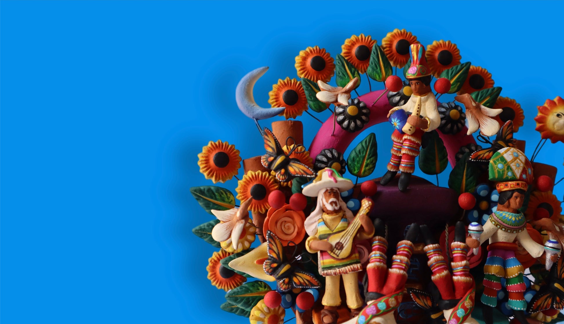 El árbol de la vida “Danza del cielo” celebra la magia y valentía del ritual de los voladores de Papantla. Dos voladores giran en el aire mientras uno toca la flauta y dos músicos acompañan con la guitarra y las maracas, todo entre flores, mariposas y aves que llenan de color y vida cada rama. Pintado y moldeado por nuestros artesanos, convierte esta pieza en una obra única que captura movimiento, tradición y libertad. Más que decoración, es un homenaje al arte, a la música y al ingenio de una pieza hecha a mano.
