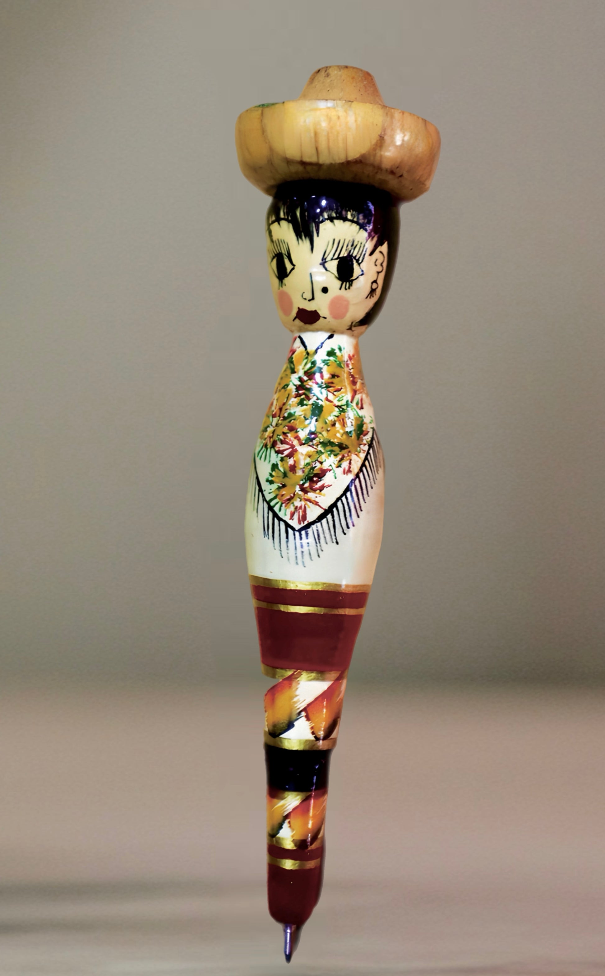 “Con el sombrero bien puesto y la mirada vivaracha, esta pluma está lista para soltar un ‘¡ándele pues!’ y ponerse a escribir corridos y recuerdos. Pintada a mano, acompaña cada trazo con la picardía y el sabor del México de antaño.”