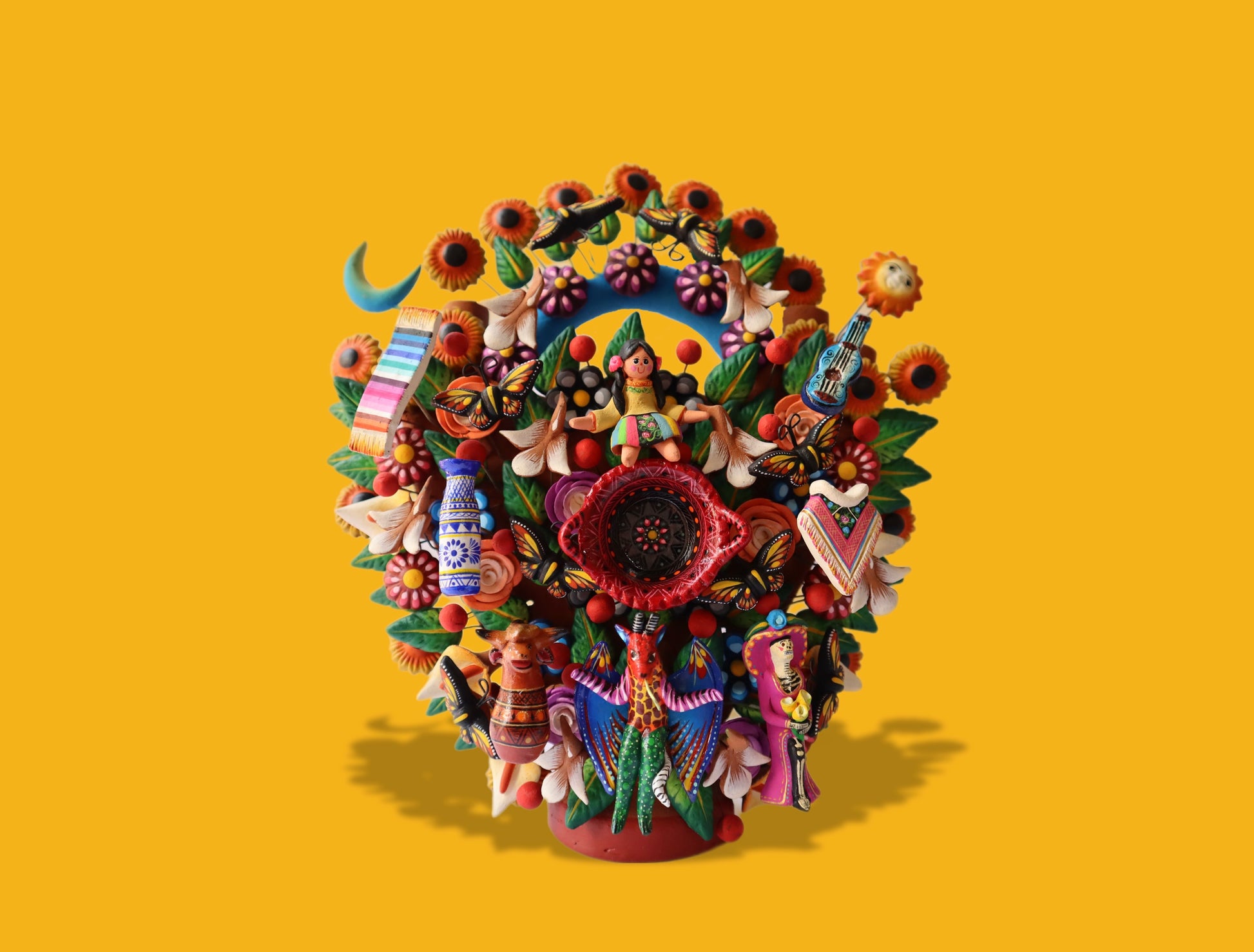 El árbol de la vida, “Entre talleres y tradiciones” celebra la riqueza del arte hecho a mano. Un alebrije, una guitarra, unos jarrones de barro, las cazuelas, los textiles y los zarapes que conviven entre las flores, las aves y las mariposas, mientras el sol y la luna acompañan la jornada del trabajo artesanal: del día a la noche, de manos expertas a piezas únicas. Cada elemento es irrepetible, es pintado y moldeado a mano por nuestros artesanos que mantienen viva la tradición. Esta obra no es solo decoración: es un homenaje a la creatividad y dedicación que solo el trabajo artesanal puede ofrecer, un tesoro que transforma cualquier espacio y lo llena de historia y color.