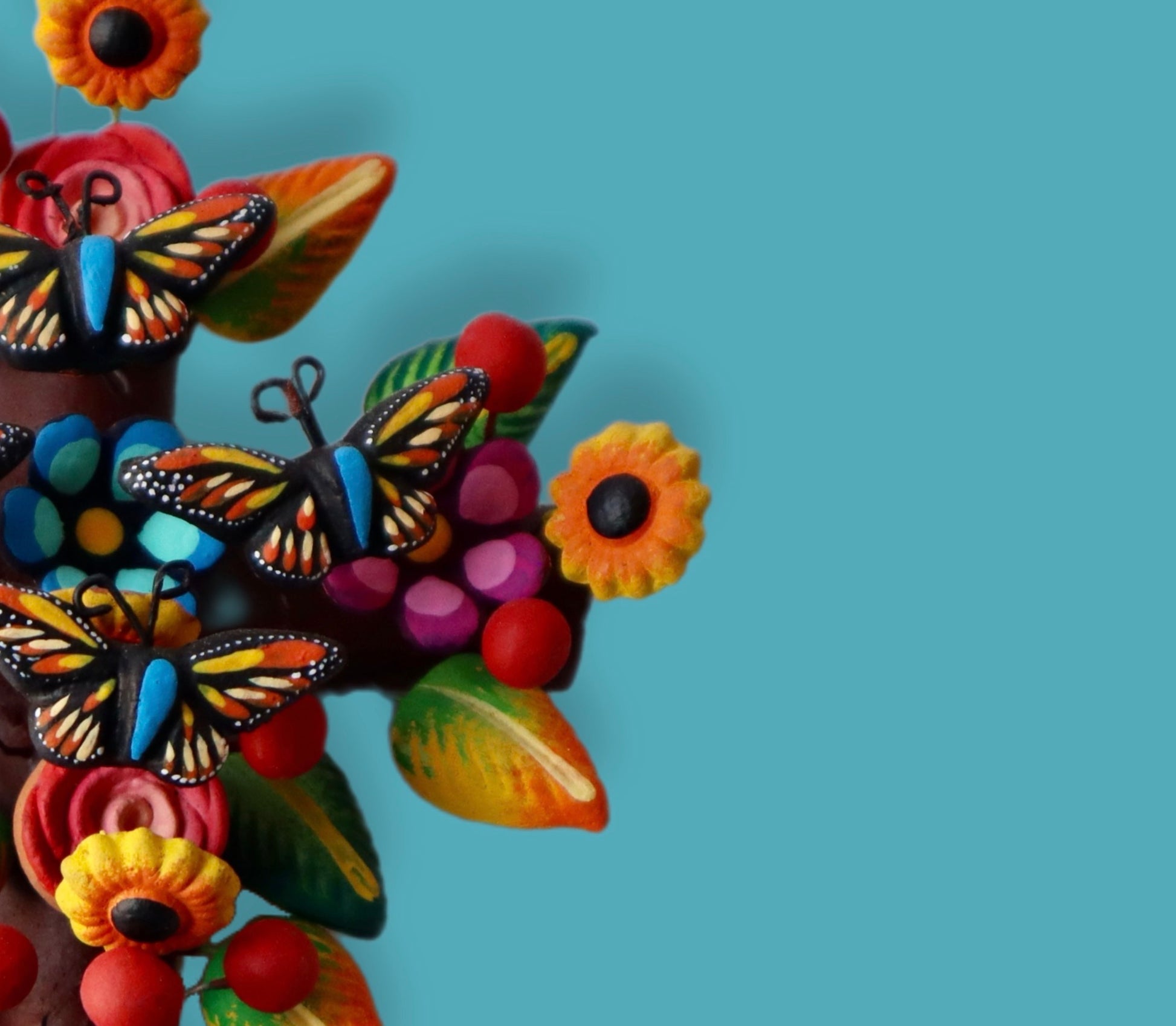 Brotan colores, alas y flores que parecen contar historias. Cada rama celebra la vida, los encuentros y los sueños que florecen sin pedir permiso. Esta pieza rinde homenaje al arte popular mexicano, donde el barro se vuelve jardín y la alegría, raíz. Porque en esta floresta, todo está vivo: la memoria, el color y el corazón de quien la mira.