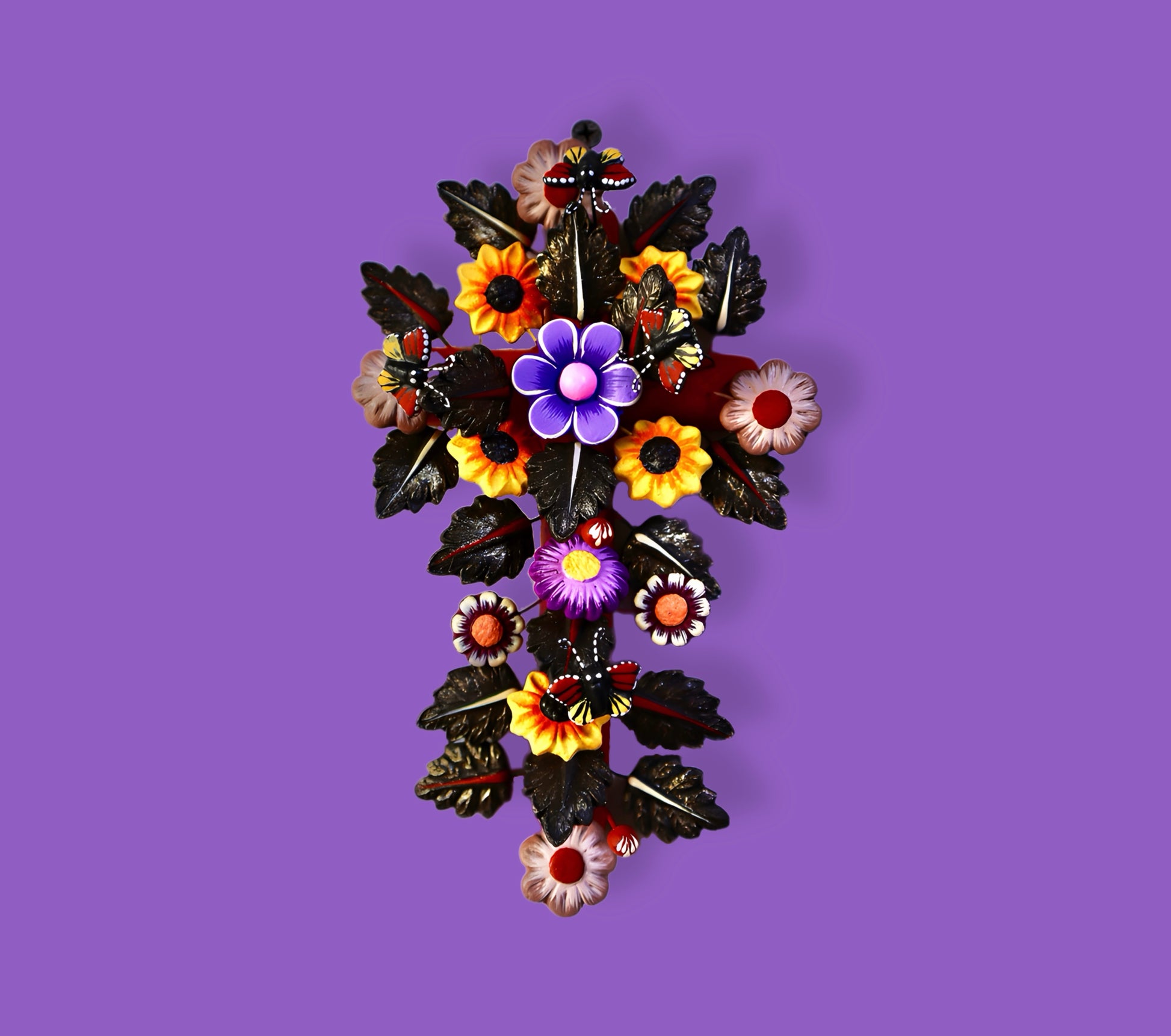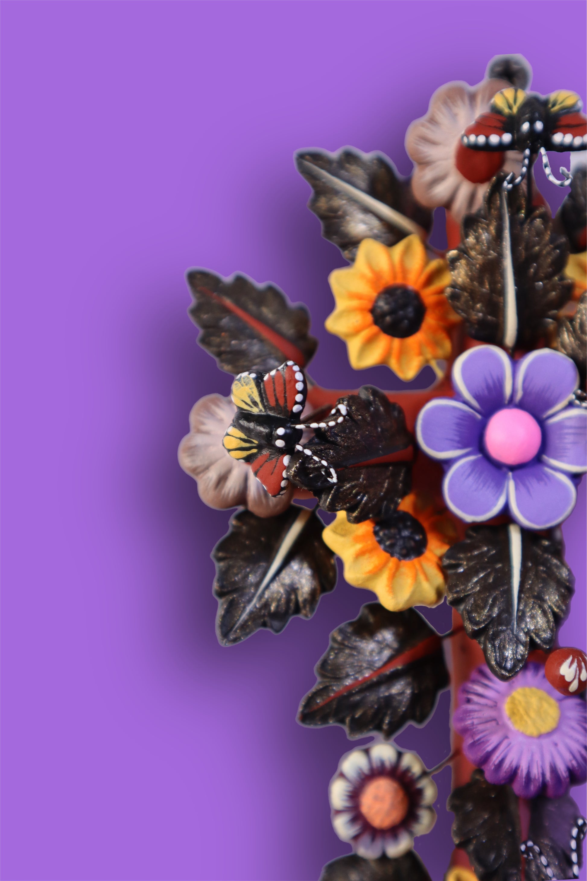 “Pertenezco a la colección Ecos del Altar. Yo soy la Floresta del Reencuentro. Nací del barro, moldeada con cuidado. Mis flores moradas guardan el duelo y la espiritualidad de quienes ya no están. Las hojas negras de mi tallo recuerdan la noche y los antiguos secretos de quienes vigilan desde el otro lado. Los girasoles y las flores de color café sostienen la vida, los recuerdos de nuestros seres queridos. Mis mariposas monarca anuncian el regreso de las almas cada otoño, tras un largo viaje de luz. En mí se encuentra un pequeño puente entre lo humano y lo eterno. En donde cada detalle fue realizado a mano.