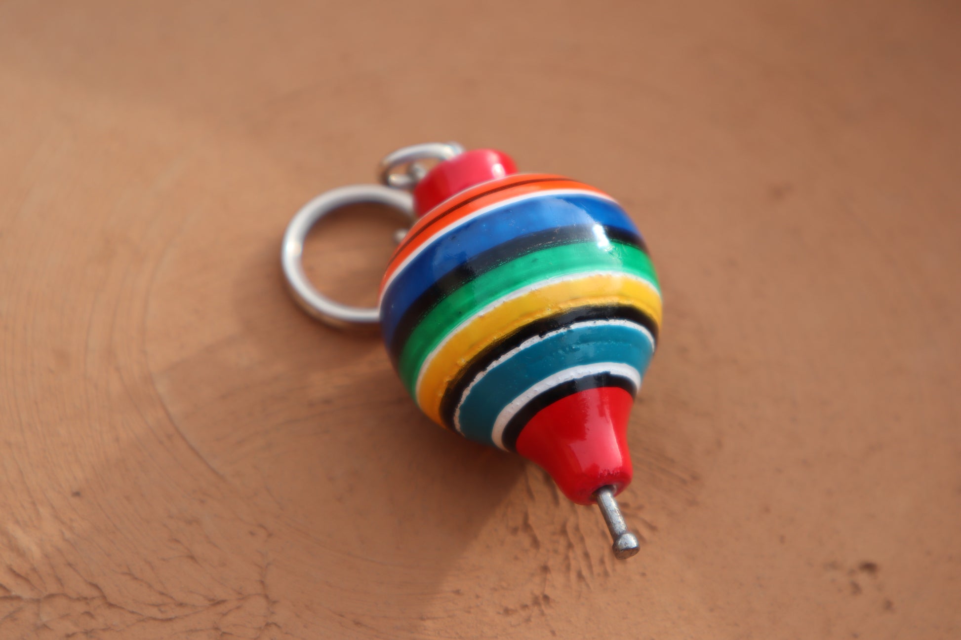 “Pequeño pero con toda la gracia de un trompo de verdad. De madera tallada y pintada a mano, se convierte en un detalle único que acompaña tus llaves. Cada uno lleva consigo la chispa de aquellos juegos de antaño, cuando el suelo era la pista y la risa era el premio.”